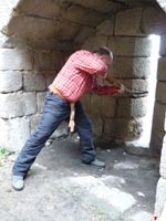 Aufgrund der Kritiken zu der Annahme von BINSY, die engen Schießnischen von Neuleiningen und auch Gräfenstein wären nicht nutzbar, hat BINSY am 10.7.2011 zusammen mit Dr. Stefan Ulrich - eben einem der Kritiker - einen praktischen Schießversuch mit Pfeil und Bogen auf Burg Neuleiningen durchgeführt. Der Versuch wurde offiziell bei Bürgermeister Adam - dem unser Dank für die Freigabe gilt - angemeldet. Die Versuche wurden auf Anregung von Stefan Ulrich derart durchgeführt, dass der Bogenschütze vor der Mauer und Scharte stand und aus etwa 2,70m Entfernung durch die Schartenöffnung auf eine Zielscheibe in 5,40m Entfernung von der Ringmauer schoss. Bei zwei Versuchen - mehr Schüsse waren wegen der hochgewucherten Brombeersträucher im Vorfeld nicht gut möglich - konnte die Zielscheibe beide Male getroffen werden, einmal trotz Tuschierens des Pfeils am Schartengewände. Diese Versuche bestätigten also die Annahme, dass ein Schuss aus einiger Entfernung durch die enge Schartenöffnung doch möglich ist. Aber die wirklichen Einschränkungen bei der Effizienz dieser Art Scharten offenbarten sich ebenso deutlich: es war wegen der Enge der Scharte kaum möglich, das Ziel anzuvisieren. In 5,40m Entfernung von der Ringmauer war die mögliche Breite des anzuvisierenden Ziels gerade mal 17cm. Bis zum Abhang, der in natürlicher Weise das Angriffsfeld in 15m Entfernung zur Ringmauer begrenzt, beträgt die Sicht- und Schussbreite aus einer Scharte gerade mal 39cm. Für den Abschuss eines potentiellen Angreifers, der sich mit angenommenen 10 km/h im Angriffsfeld bewegt, ist dann auf dessen Weg durch den Schusssektor gerade mal 0,06 Sekunden bzw. 0,1 Sekunden Zeit. Damit wird klar, dass jeder Treffer nur Zufallstreffer sein kann. Strategisch gesehen ist die Anlage eher unbrauchbar. Das Ergebnis des Tages war demnach: ja, ein Schuss durch die Scharte ist möglich, aber die Gesamtanlage hat wie angenommen eher symbolischen Charakter bzw. der Bauherr, Friedrich III. von Leiningen wollte demonstrieren, dass er in der Lage und "potent" genug war, "moderne" Entwicklungen aus Frankreich auf- und zu übernehmen. Also reine Machtdemonstration!