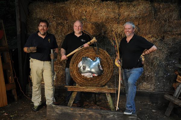 Bei einem Beschusstest eines Brustharnisches mit dem Langbogen, der Armbrust und der Hakenbüchse sollte auf der Schönburg in Oberwesel am Rhein die Wirksamkeit der jeweiligen Waffe festgestellt werden. Für den Versuchsaufbau und die Aufnahmen mit der Highspeedkamera zeichnete sich Menno Mennenga von der Firma Reunion verantwortlich. Die wissenschaftliche Begleitung lag in der Hand von Joachim Zeune (Foto 1).
