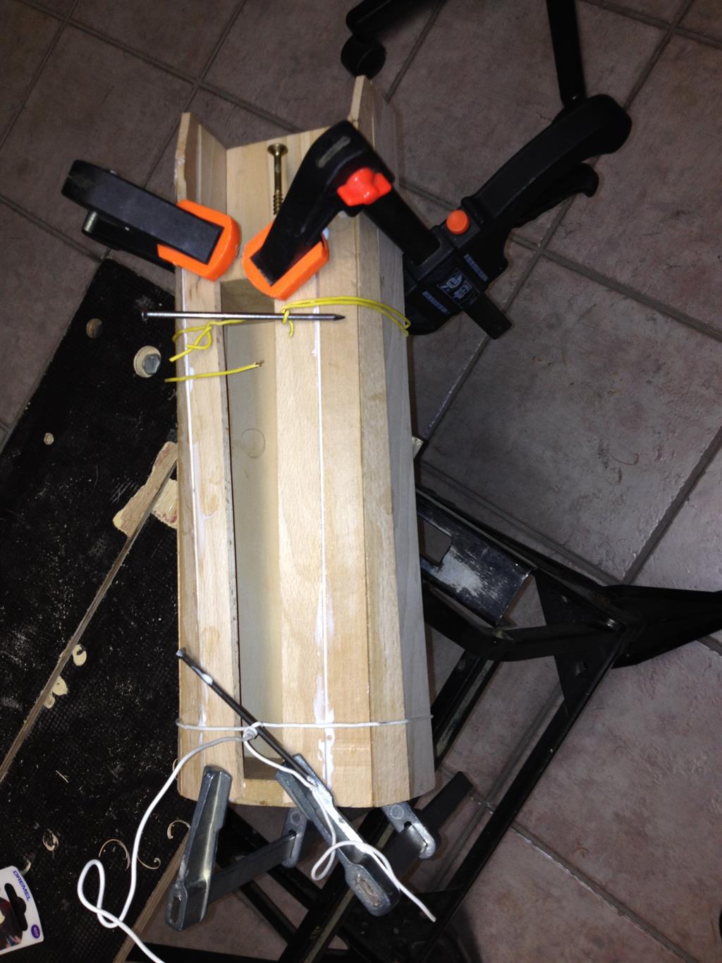 Nach und nach wurden die Buchenleisten in Form gebracht und aneinander geleimt. Gehalten wurden die Leisten während des Trocknens mit Schraubzwingen und verdrillten Drähten. | ||||