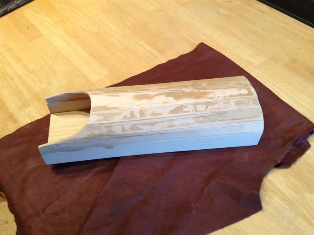 Vorbereitung für das Beleimen des Rohbaus mit Leder. Als Leder für die Innenausstattung habe ich ein dünnes Fensterleder eingesetzt. Für die Außenbespannung habe ich ebenfalls ein Fensterleder genommen, dass aber von Hause aus schon alt aussah und sich steifer anfühlte. Damit war das Nachbearbeiten auf "antik" nicht mehr so aufwändig. Für den oberen Teil des Köchers wurde ein dunkelrot gefärbtes Glattleder ausgeschnitten und verwendet. Alle Leimarbeiten wurden mit Ponal Holzleim erledigt, welcher sich zum Kleben von Leder auf Holz schon mehrfach sehr gut bewährt hatte (so beim Bau von Schwertscheiden). |