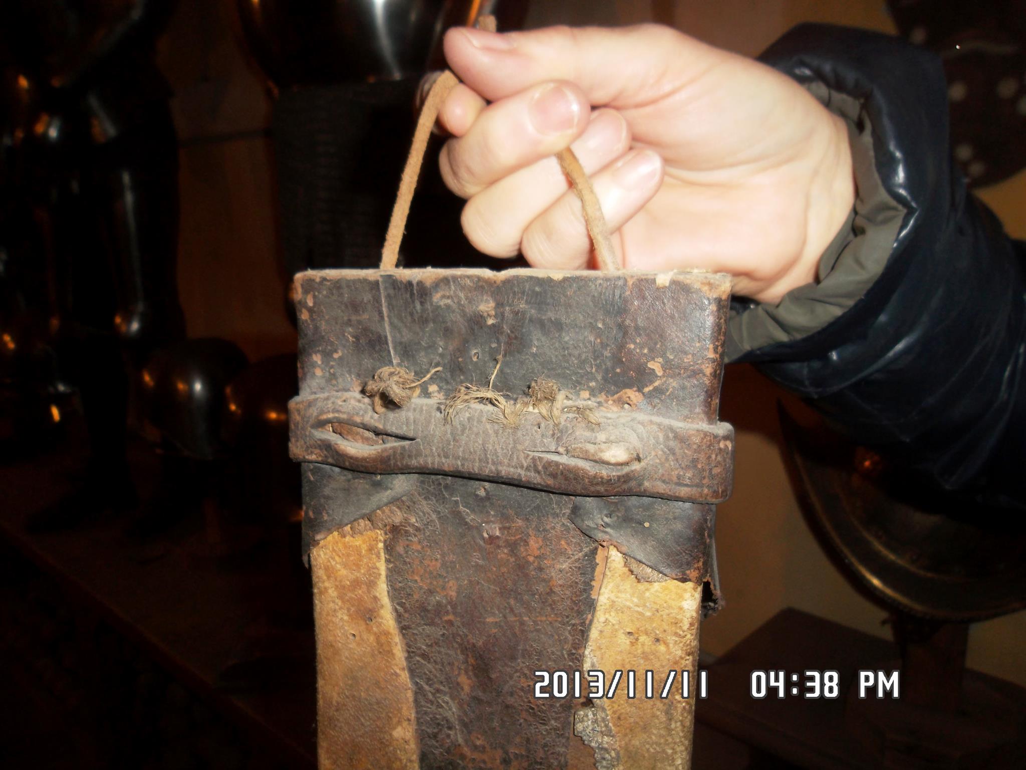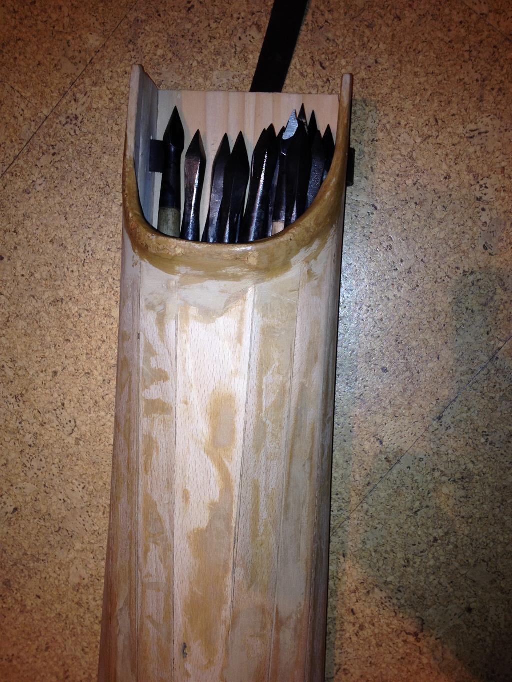 Hier im Original deutlich das hölzerne Gerippe und der Lederüberzug zu erkennen. Aufgrund meiner persönlichen Unkenntnis des Originalköchers bleibt sowohl der Verschluss des Köchers nach unten (das heute hineingestopfte Papier kann nur ein Behelf sein!!), als auch die Frage, ob der Holzkörper aus einem bzw. zwei Stücken gebaut ist, oder ob es sich - wie im Nachbau realisiert - um mehrere zusammengeleimte Leisten handelt, unklar. | ||||