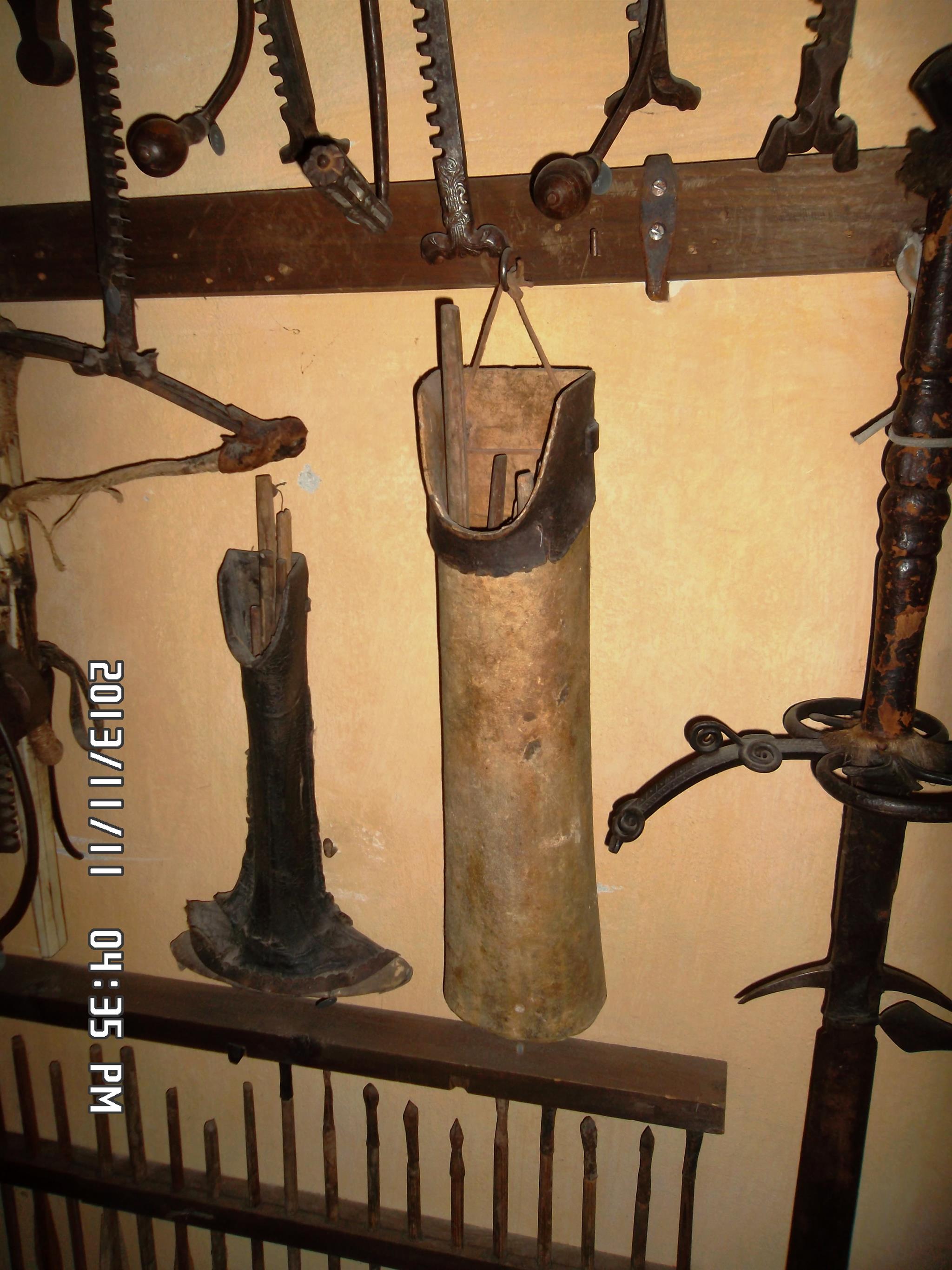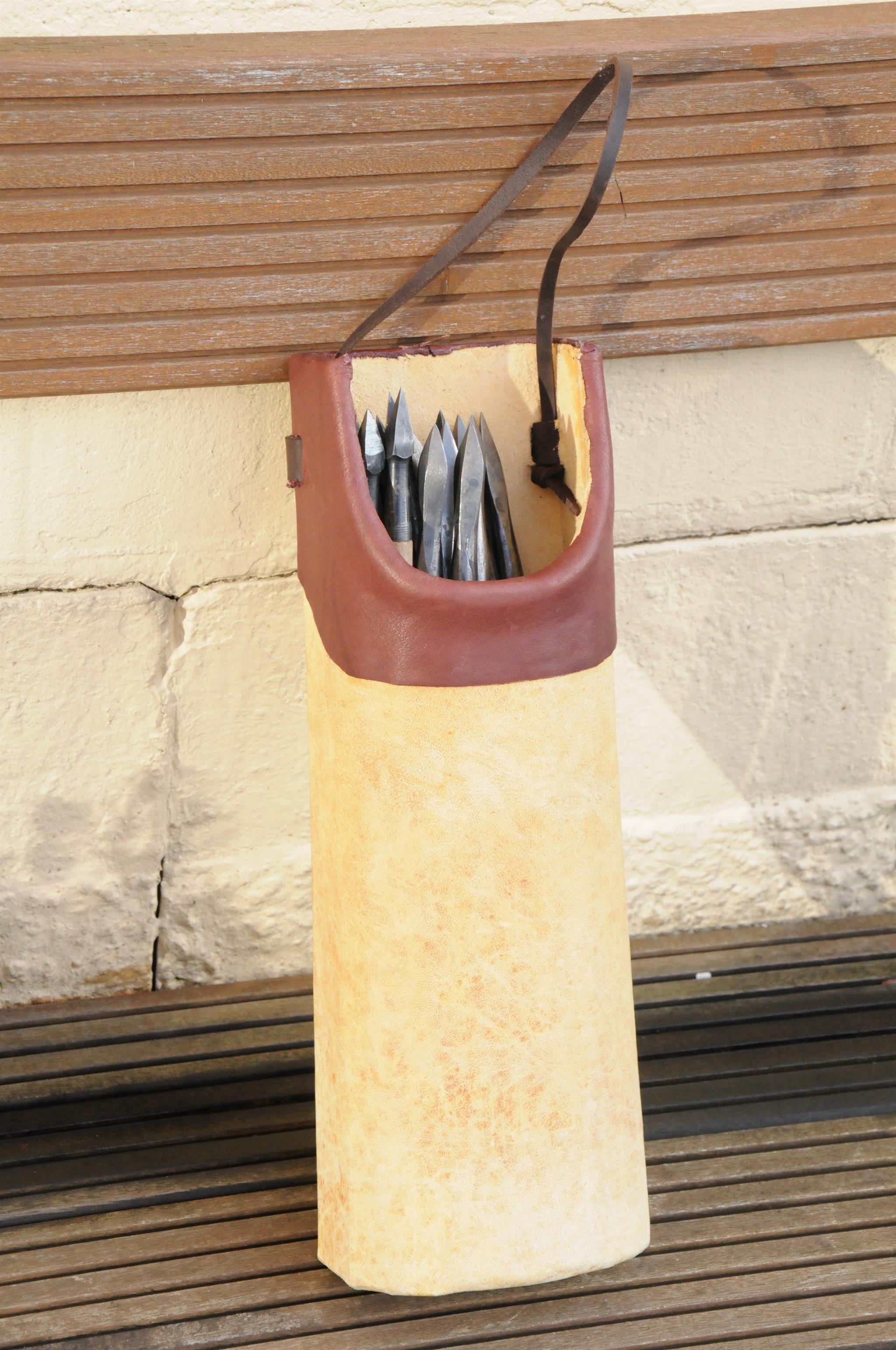 Nach der Produktion einer kleinen Serie von Bolzen für die neue Armbrust war der Nachbau eines möglichst authentischen Köchers zur Aufbewahrung notwendig geworden. Im Internet findet man dazu allerlei Links und Anleitungen, wobei die Authentizität relativ unklar ist. Allenthalben erfährt man bei Recherchen, dass die Köcher eine kolbenförmige, bauchige Form hatten, unten etwas breiter, dicker, da die Bolzen umgekehrt, also mit den Spitzen nach oben, in den Köcher gesteckt wurden, damit man schnell und direkt die richtige Auswahl von Bolzen für den gewünschten Zweck treffen konnte. Das bedingte wegen der "Befiederung der Bolzen", dass das untere Ende des Köchers etwas dicker, umfangreicher war. Bei der Auswahl eines realen Originals als Vorbild für den Nachbau fiel die Wahl auf einen Bolzenköcher, der in der bekannten Rüstkammer der Churburg in Schluderns im Vinschgau in Südtirol ausgestellt ist. Als Bauvorlage dienten mehrere Fotos, die Phillip Baron von Hohenbühel, der Präsident des Südtiroler Burgeninstituts, freundlicherweise vor Ort anfertigte und mir zukommen ließ. Hierfür meinen herzlichen Dank! Da mir für den Köcher keine exakten Maße vorlagen, konnte der Nachbau nur die generelle Form und die Machart nachempfinden. Das heißt der Nachbau entspricht nicht den exakten Maßen und weicht auch etwas von der Gesamtgröße ab. Das ist auch der Tatsache geschuldet, dass mein Nachbau etwa 20 Bolzen aufnehmen können sollte. Das Churburger Original scheint mir für etwas weniger Bolzen angefertigt worden zu sein. Das Original wie der Nachbau haben einen hölzernen Kern, quasi ein Gerippe, das mit verschiedenen Ledern überzogen wurde.
