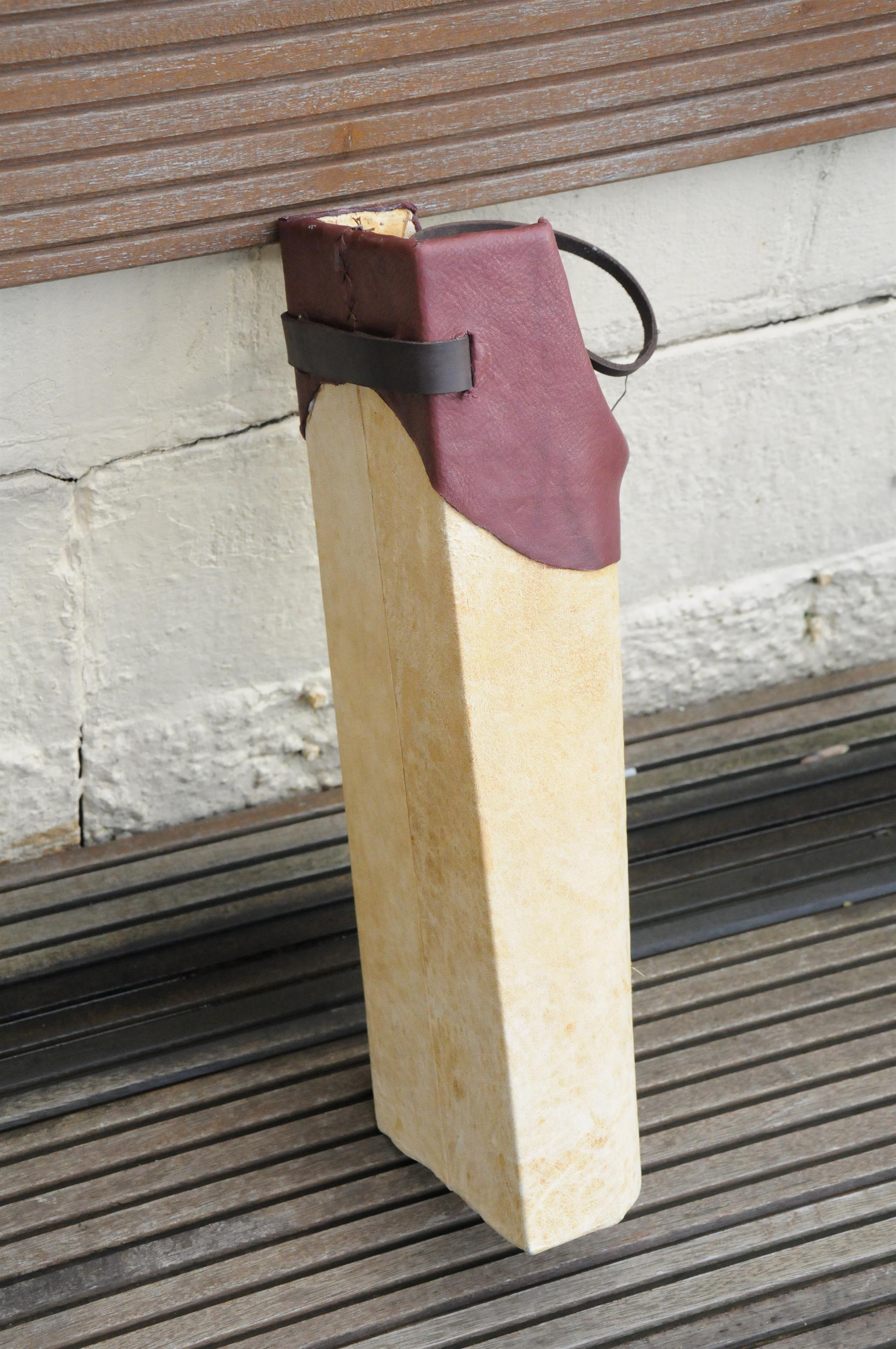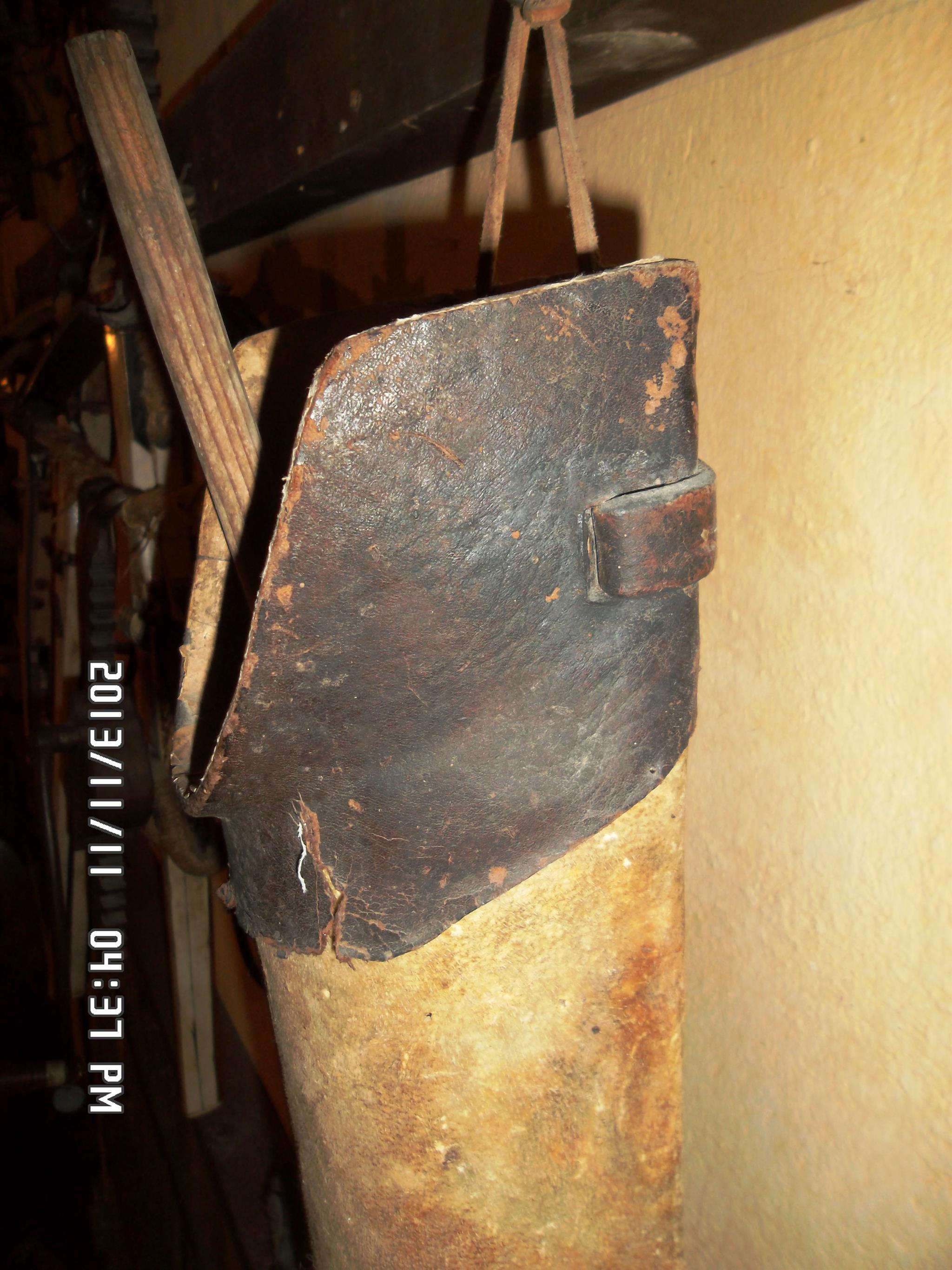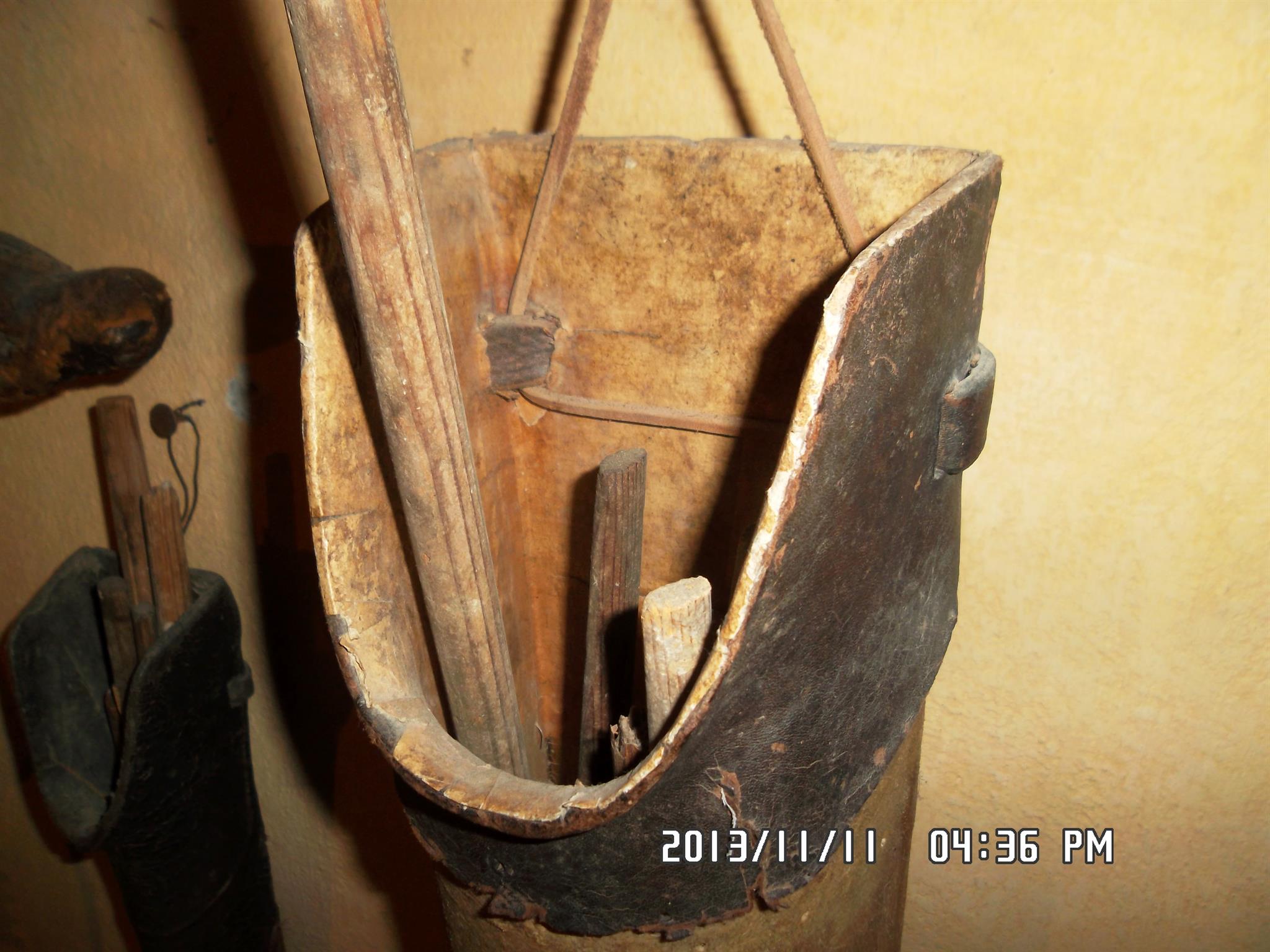 Danach sah der Köcher so aus (Foto links). Der Nachbauköcher ist 39cm lang und 12 cm (oben) bzw. 13,5 cm (unten) breit. An der Öffnung ist er 10cm dick, unten nur 7,5cm. Er wiegt leer 620 Gramm. |