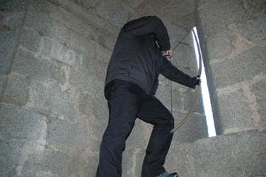 Schuss mit dem Langbogen aus einer Schießscharte von Burg Ortenberg | ||||